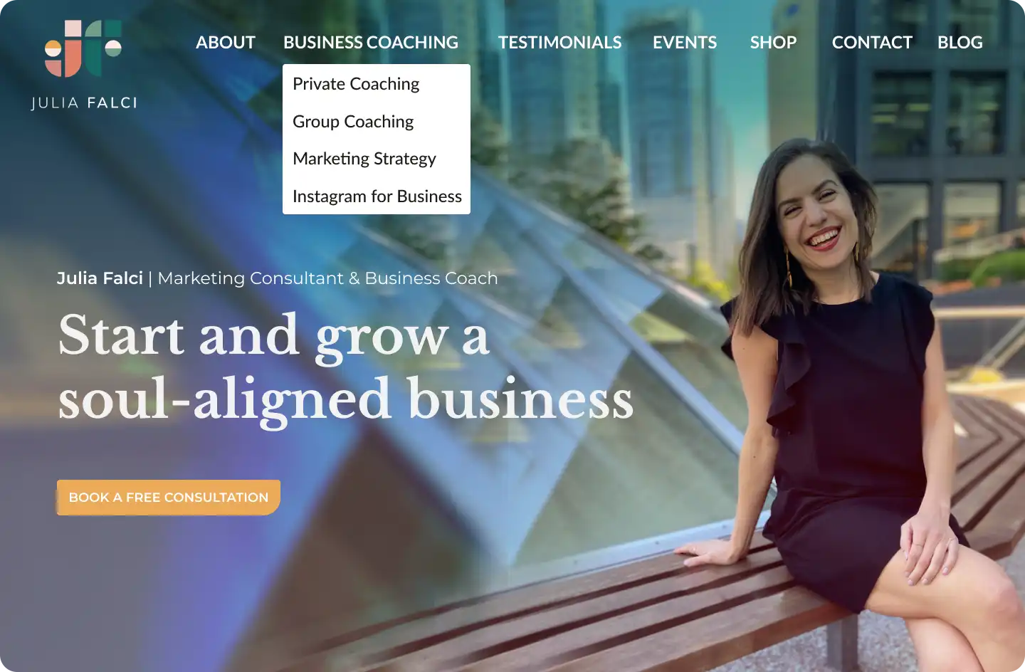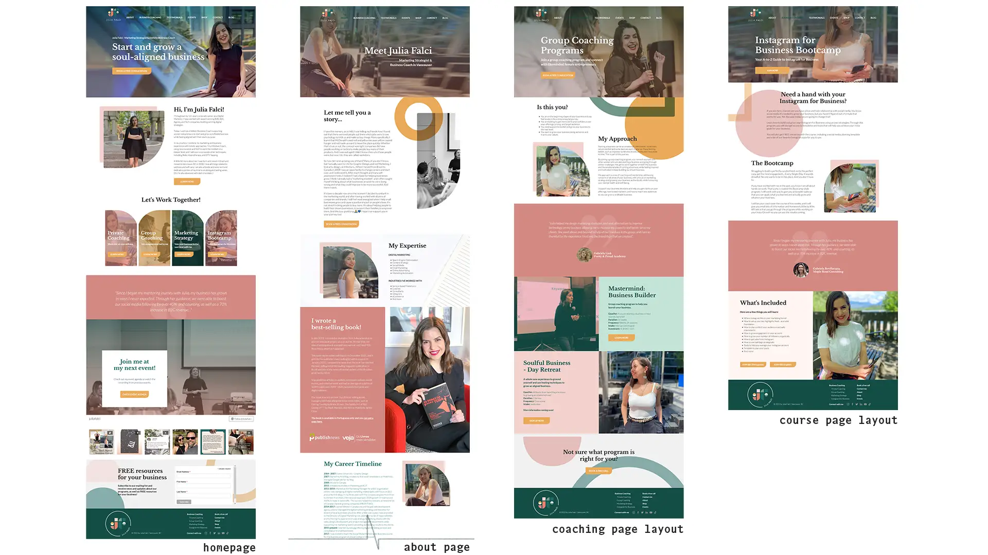 Julia Falci is a Marketing Strategist & Holistic Business Coach based in Vancouver-BC. Her previous website presented some key issues such as an extensive menu with a few options that were hidden from the main page, and information that appeared crammed and hard to follow. This project sought to solve those problems through a complete review of the information architecture of the website, as well as a complete redesign of the pages for stronger, more mature visual branding and increased effectiveness of call-to-actions.