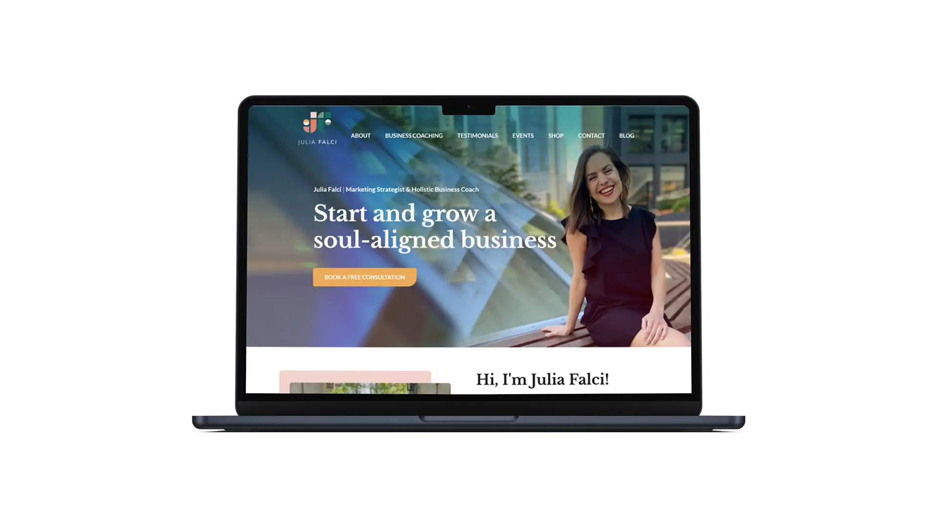 The concept for the whole website redesign evolved from the graphic shapes used in Julia Falci's logo (from the original design). The content, including images and buttons, followed those shapes, integrating the whole visual branding cohesively.