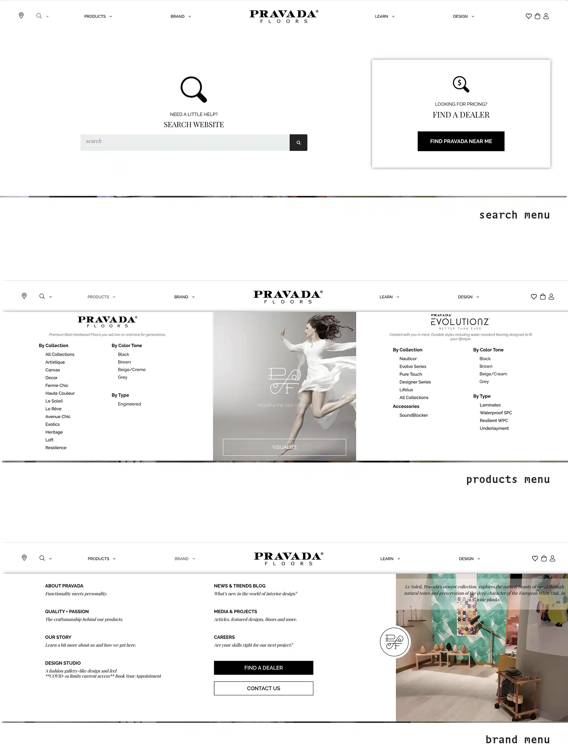 Pravada's website design process started with its information architecture. Top navigation, menus and footer were the main targets given our goal to ensure clear navigation to all their three types of clients. Menus were organized by related themes. Considering the amount of information/pages they link to, we designed each menu to look different so that users could re-engage each time and have a better chance at finding the information they were looking for. When it comes to content, the design focused on providing quick product information for users that tend to revisit the website often looking for specific information (dealers and designers). For other users (homeowners), we focused on providing extra information as we learned that they would take months researching these products prior to making a purchasing decision.